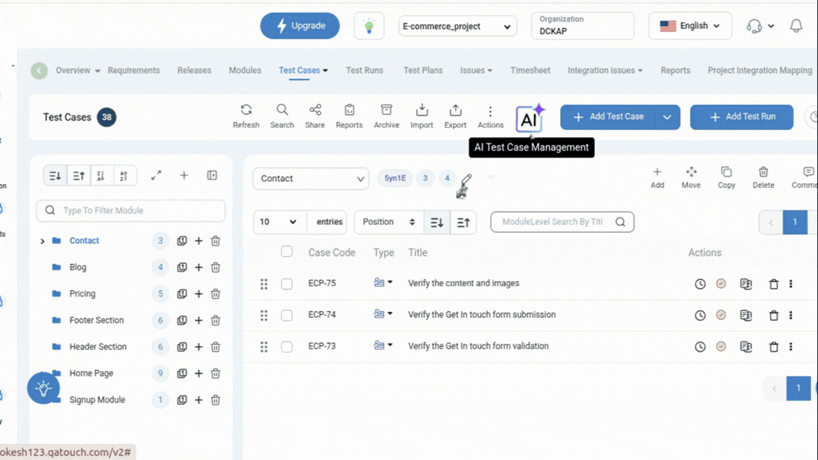 Enter a simple prompt (like “Login module” or “Shopping cart edge cases”). Choose the number of test cases to generate (e.g., 5, 10, 15). Free user can select 5 limit Instantly receive structured, detailed test cases with clear steps and validations. Save them directly into your QA Touch project.