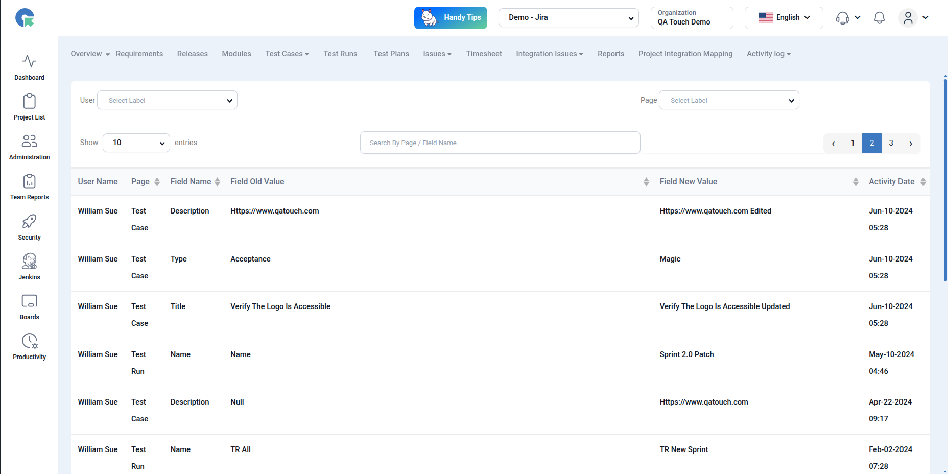- Page → Filter logs by module (Test Case, Issues, Test Run, Requirements)