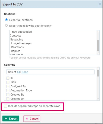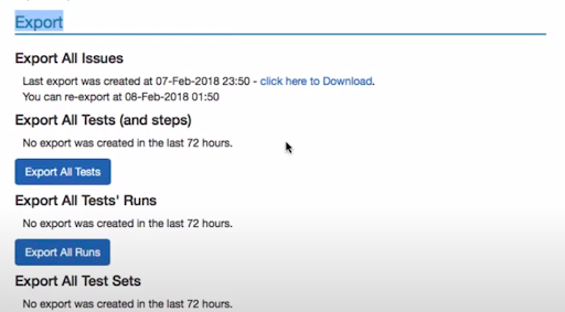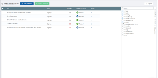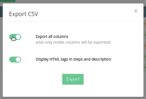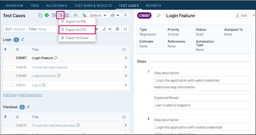 - Go to the Test Cases page. Click on the Export icon at the top right. Choose “Export to CSV” format.