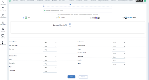 Mapping Fields: Mapping of Columns from your existing Test data to QA Touch Fields. Module name and Test case title are mandatory, Other fields are optional.