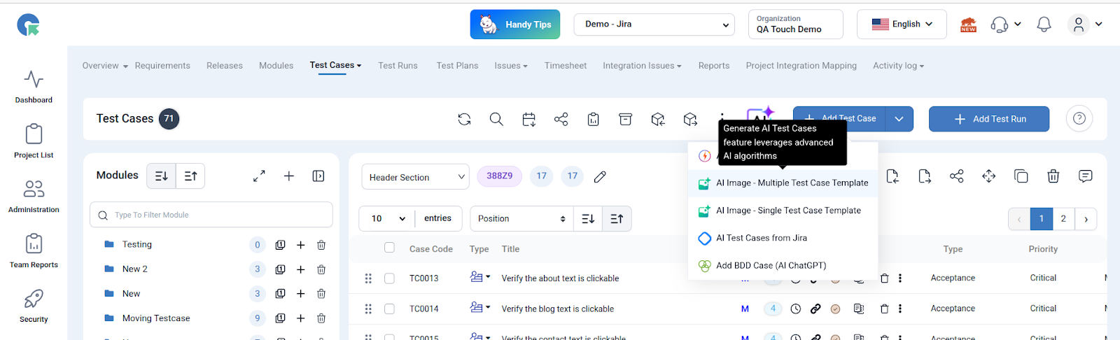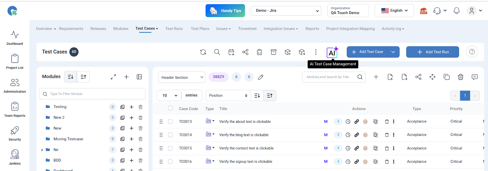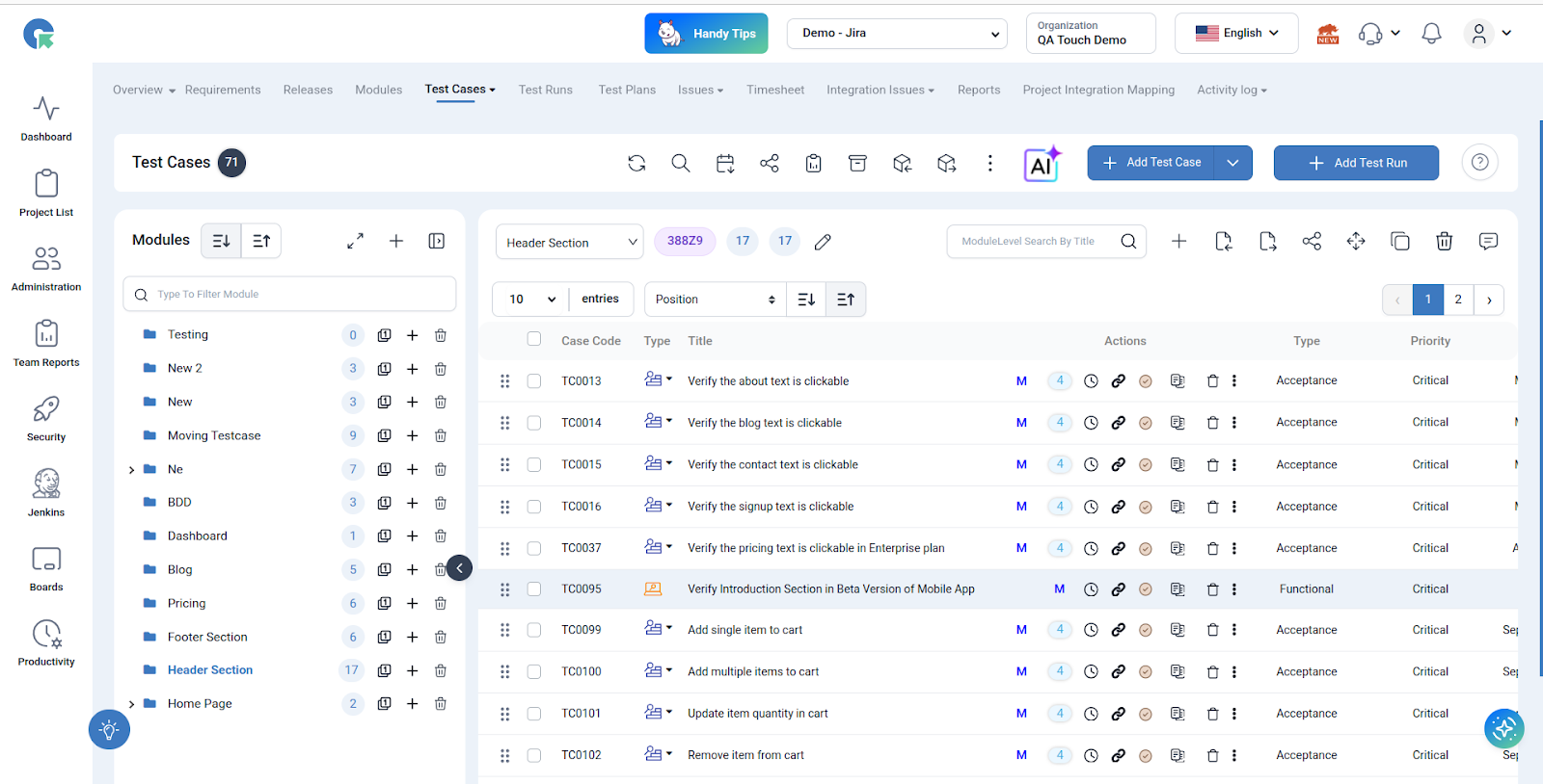- Navigate to the Test Cases section in QA Touch.