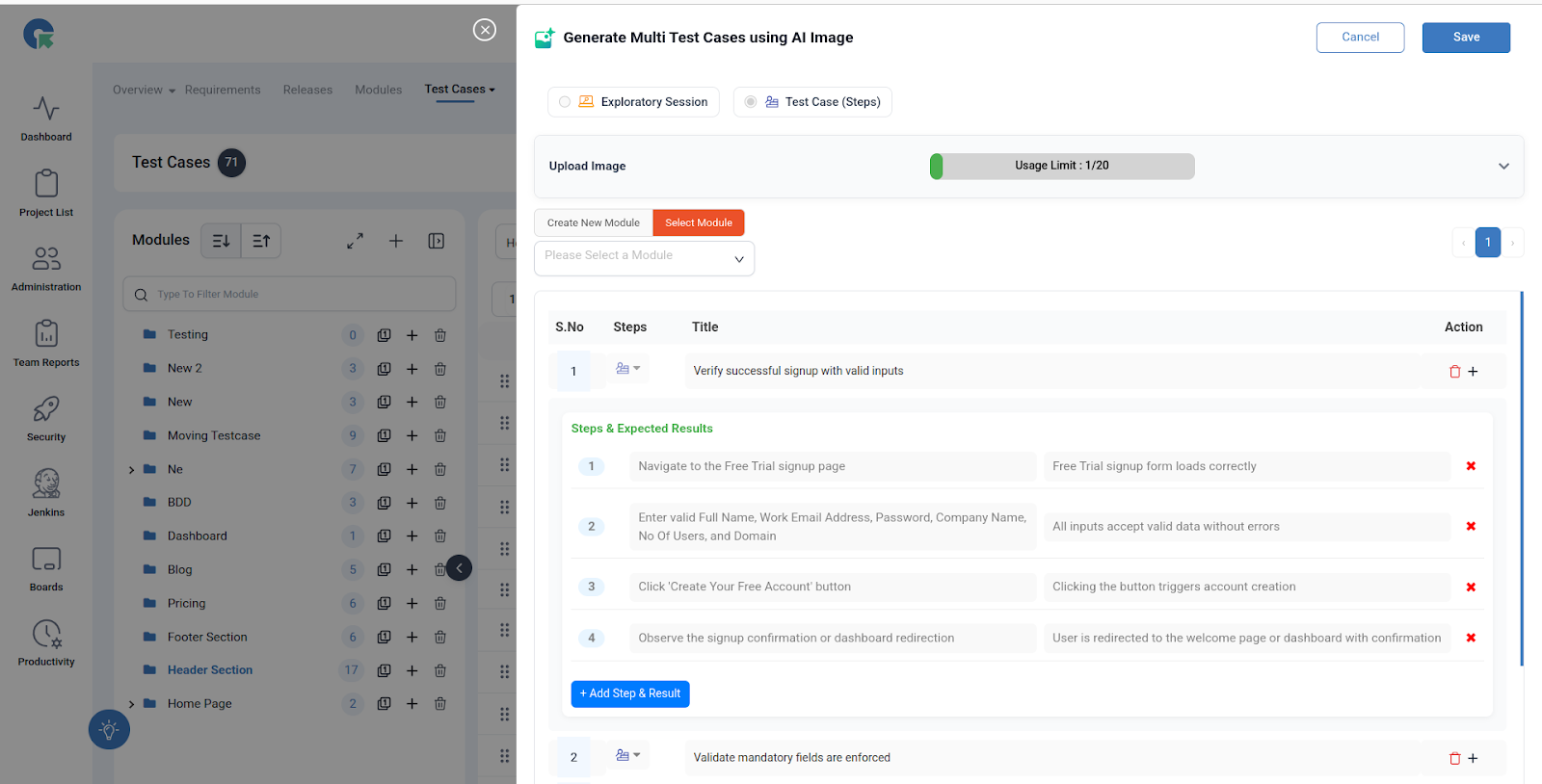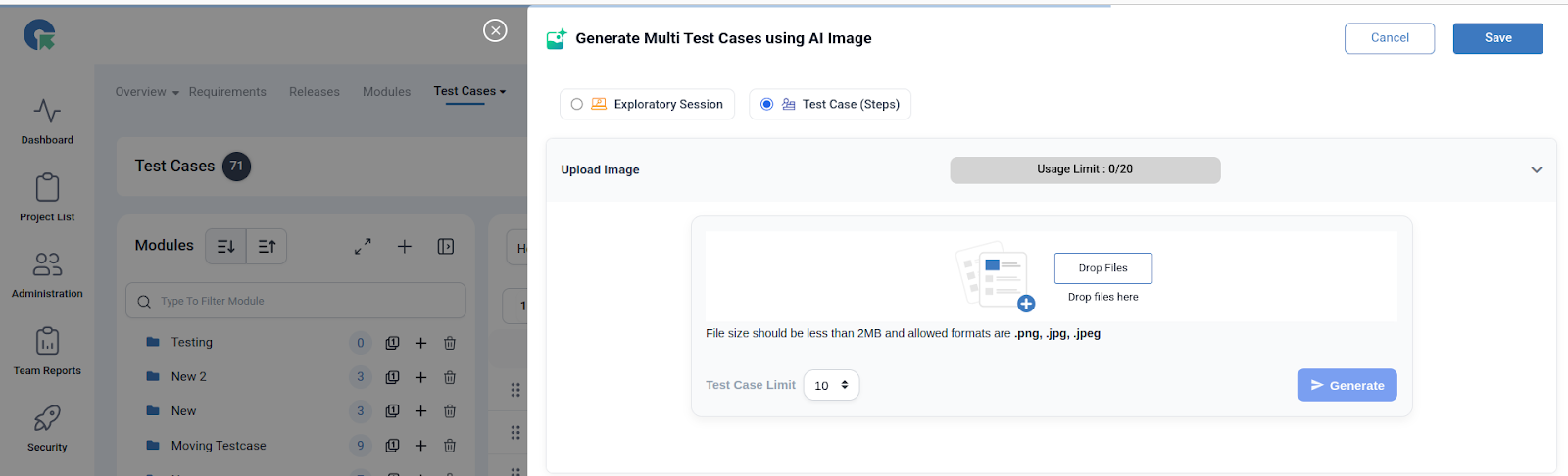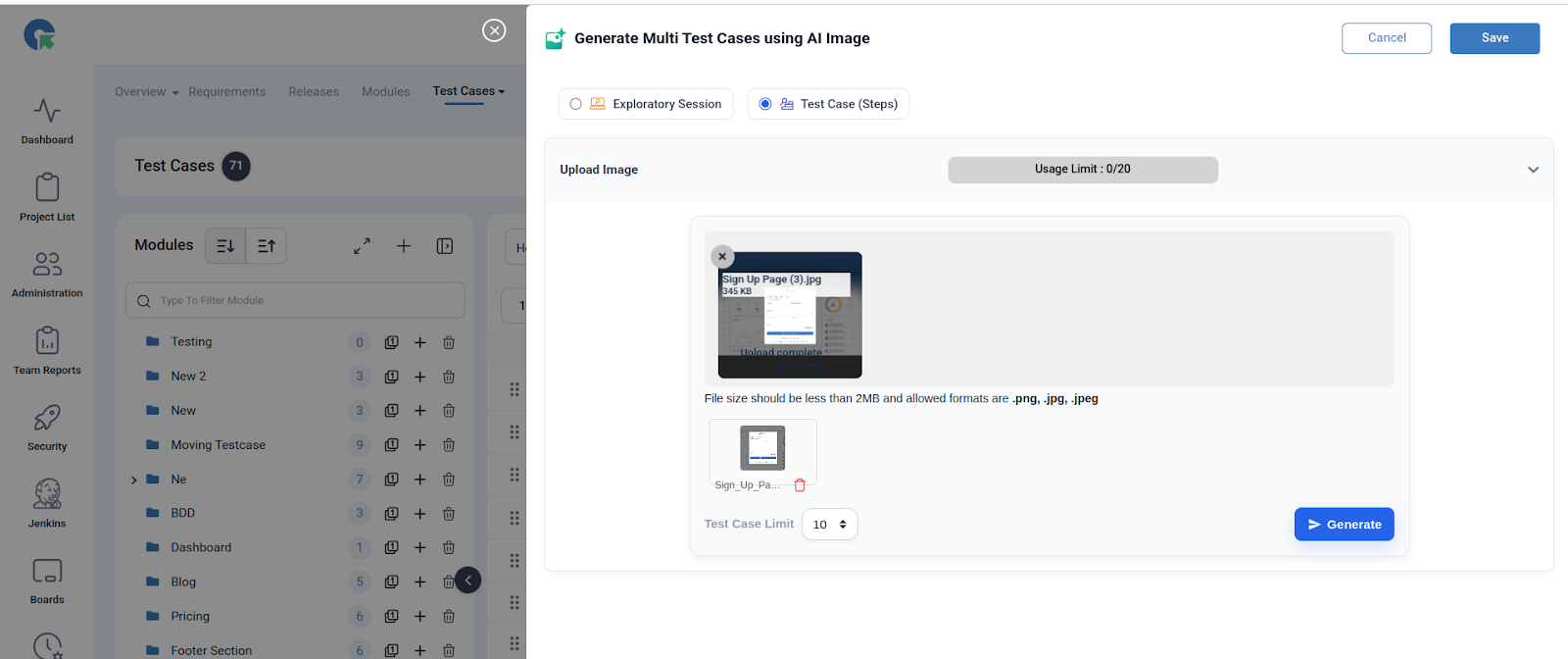 After the successful rollout of Generate Multi Test Cases using AI Prompt QA Touch is thrilled to announce another groundbreaking innovation. QA engineers can now upload an image (like a UI screenshot, workflow screen, or form), and QA Touch will automatically generate structured test cases from it.