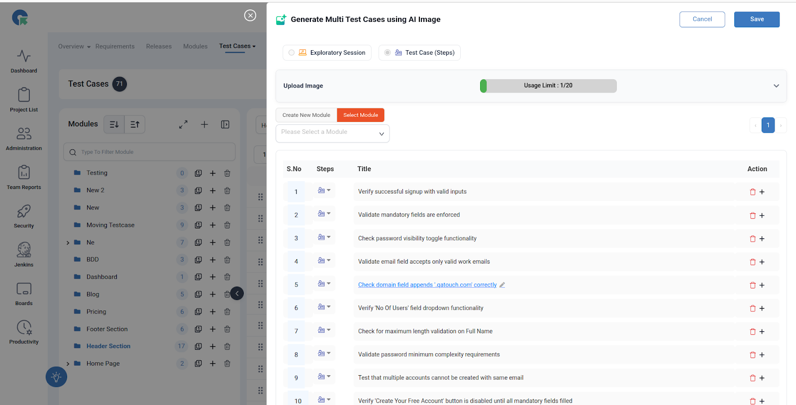 - Click Generate within seconds based on limit, QA Touch will create detailed test cases.
