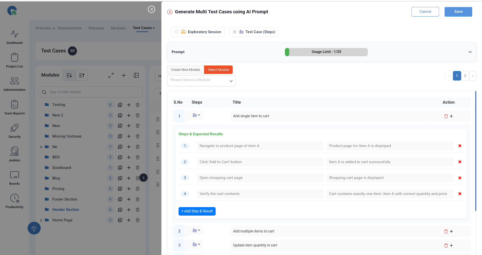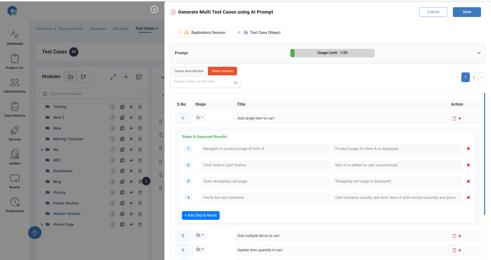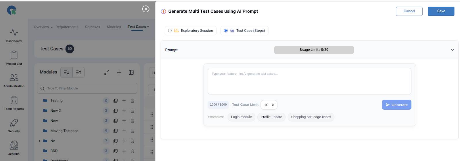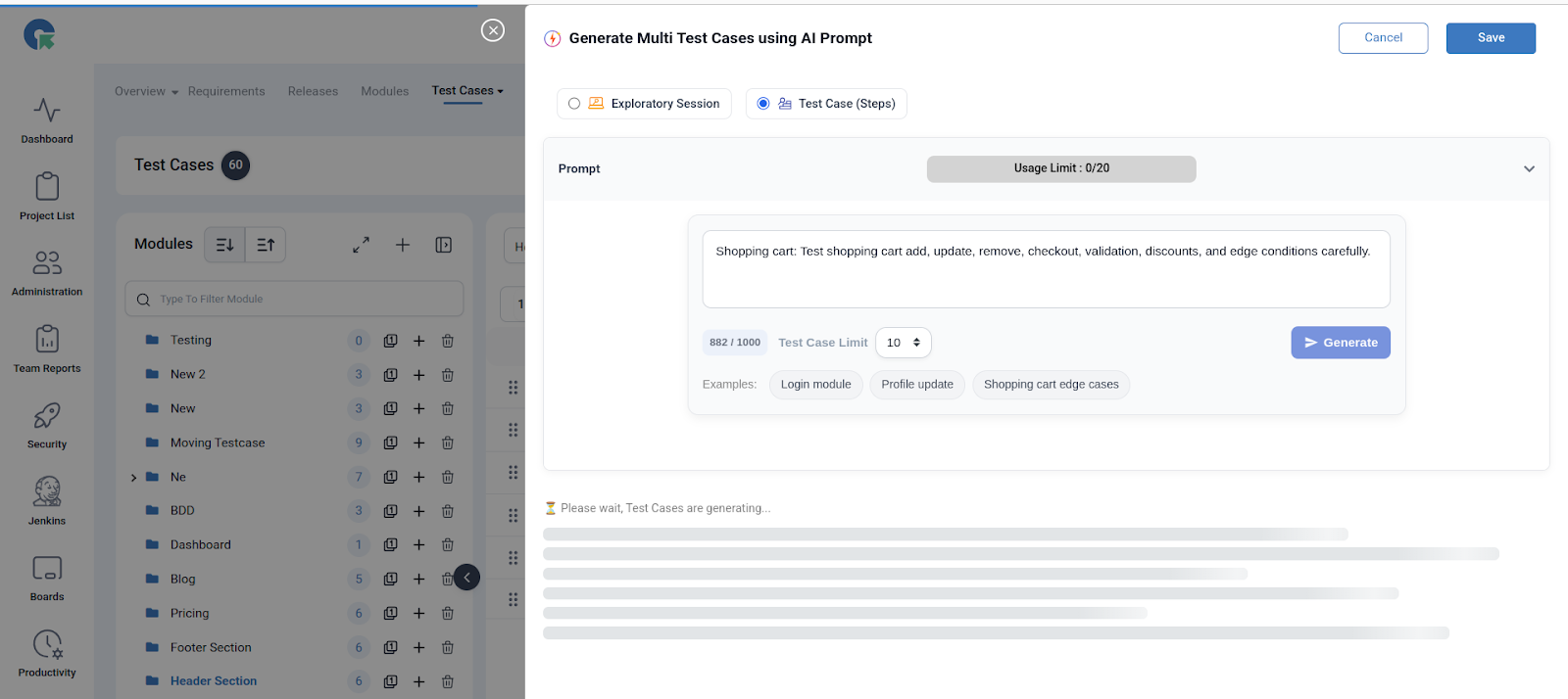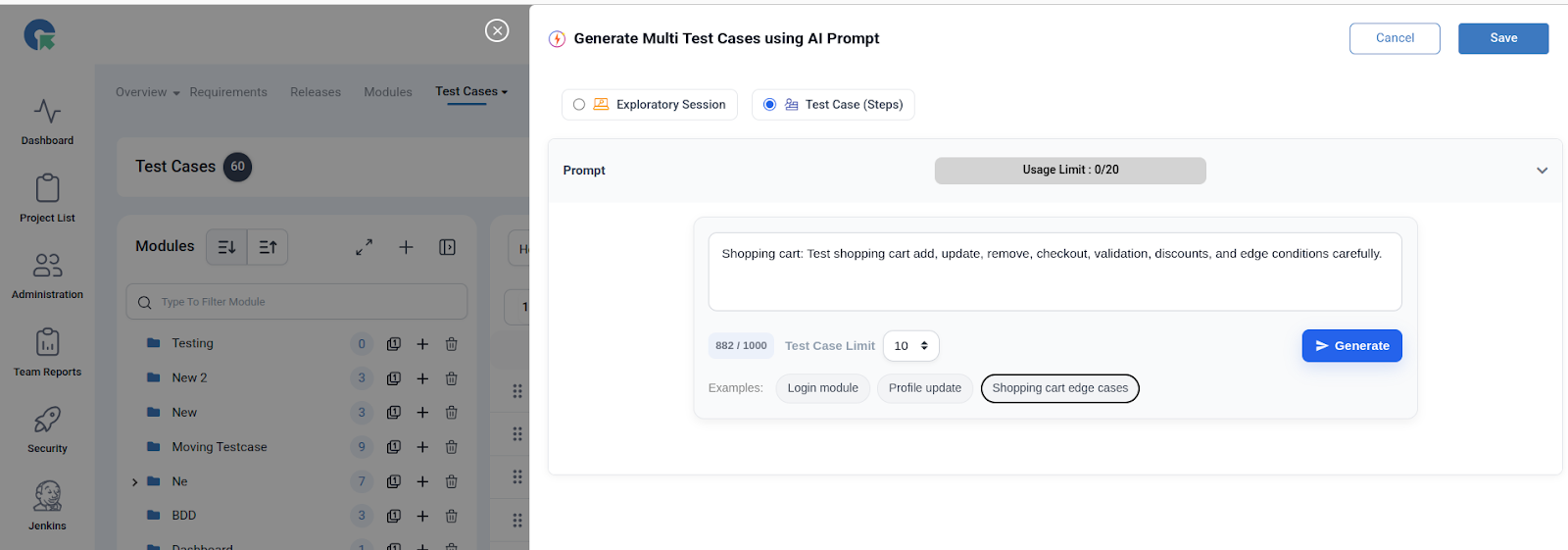 - Enter your feature/module prompt in natural language. Example: “Shopping cart: Test add, update, remove, checkout, validation, discounts, and edge cases carefully.”