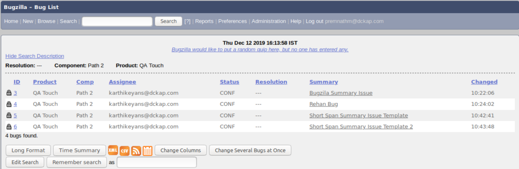 Snapshot of Messages Posted in Bugzilla by QA Touch