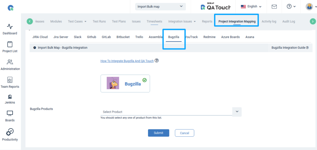 - Select a Bugzilla project from the list and click submit to Map. Have a look at the below screenshot for your reference.
