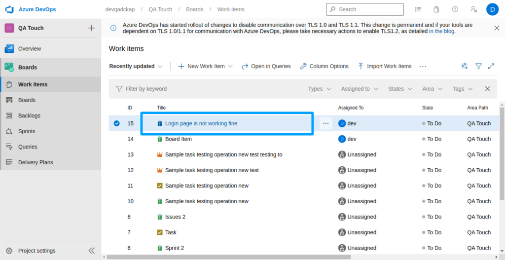 Snapshot of Work Items Posted in Azure Board by QA Touch