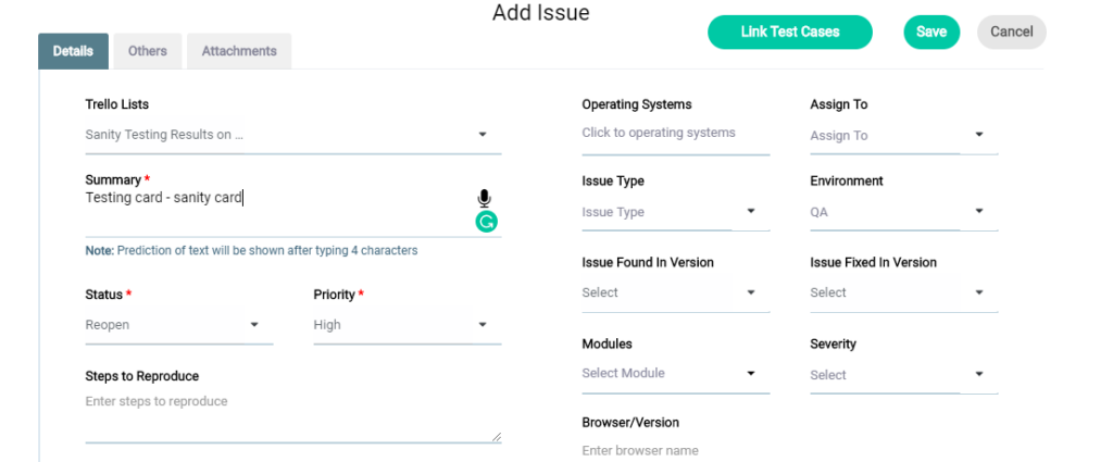 I have selected a sample “Sanity Testing Result” Trello list in my card, filled in all the information, and clicked the ‘Save’ button, where the bug is stored in the Trello “Sanity Testing Result”.