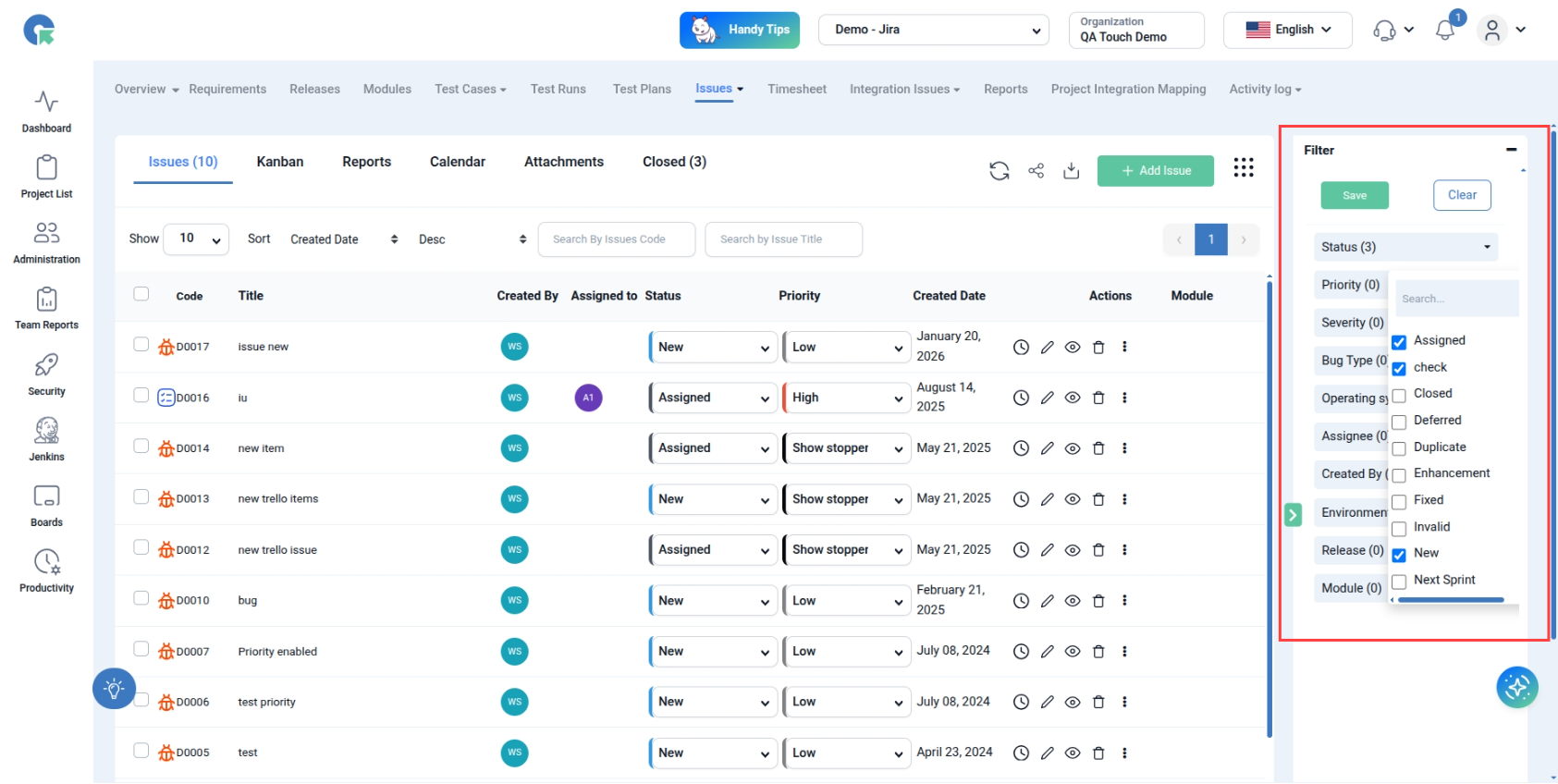 The Save Filter feature in the Issues module allows you to quickly reuse frequently used filter combinations such as Status, Priority, Severity, Assignee, and more.