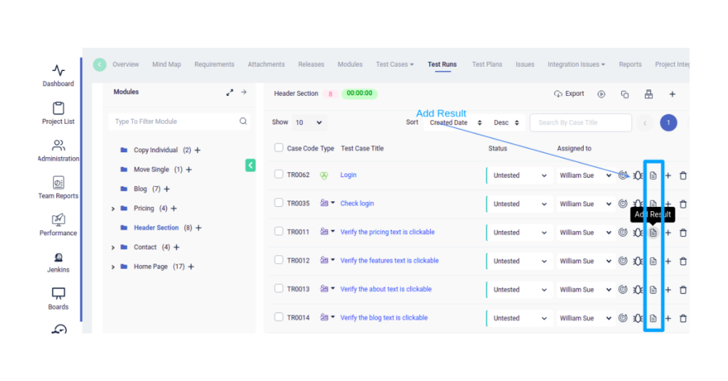 Go to the Test Run & Result page, and click the Add Result icon refer to the screenshot below.
