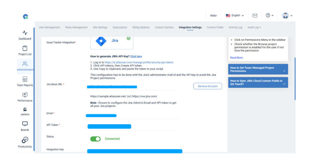 This configuration has to be done with Jira’s administrator mail id and the API key to avoid the Jira Project permissions issue.