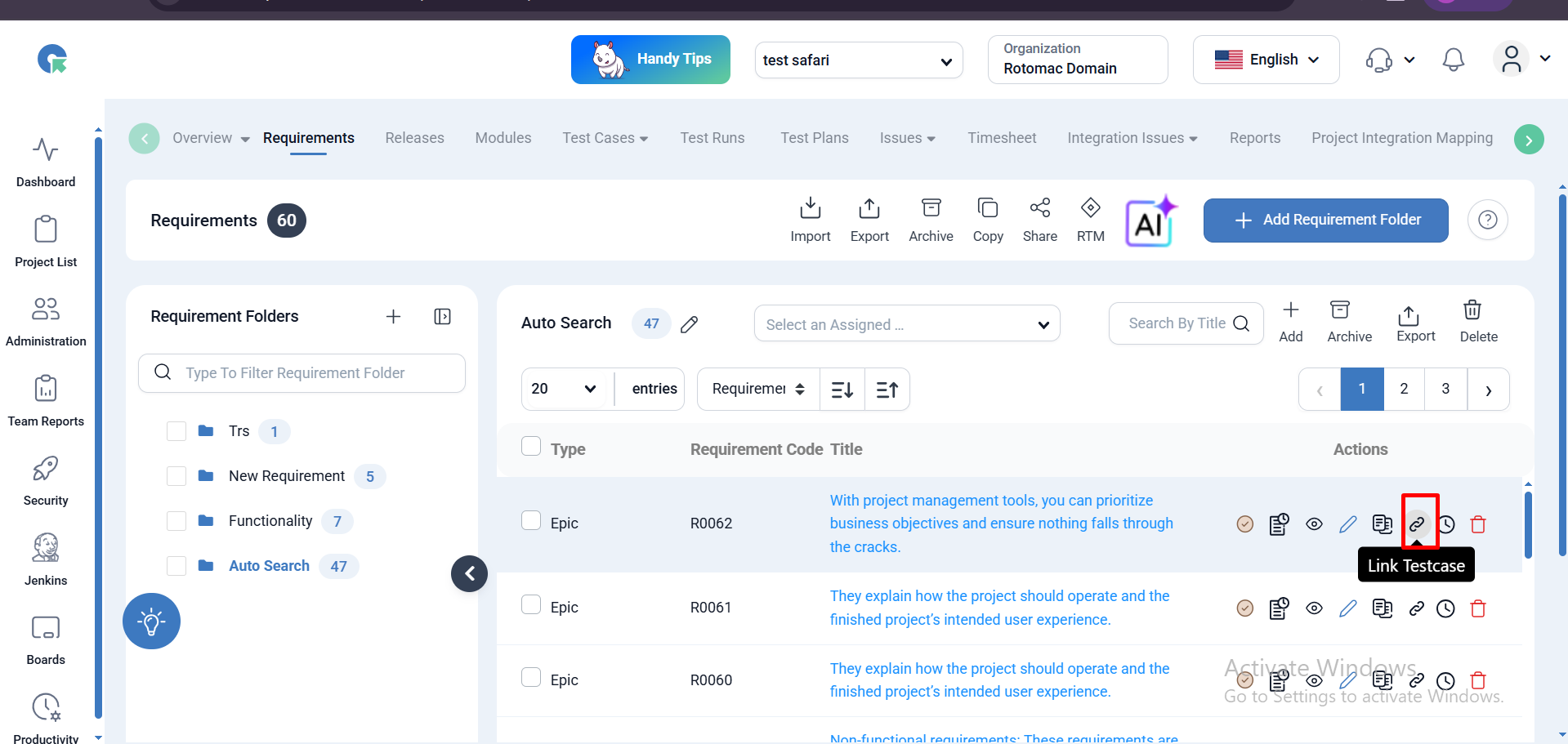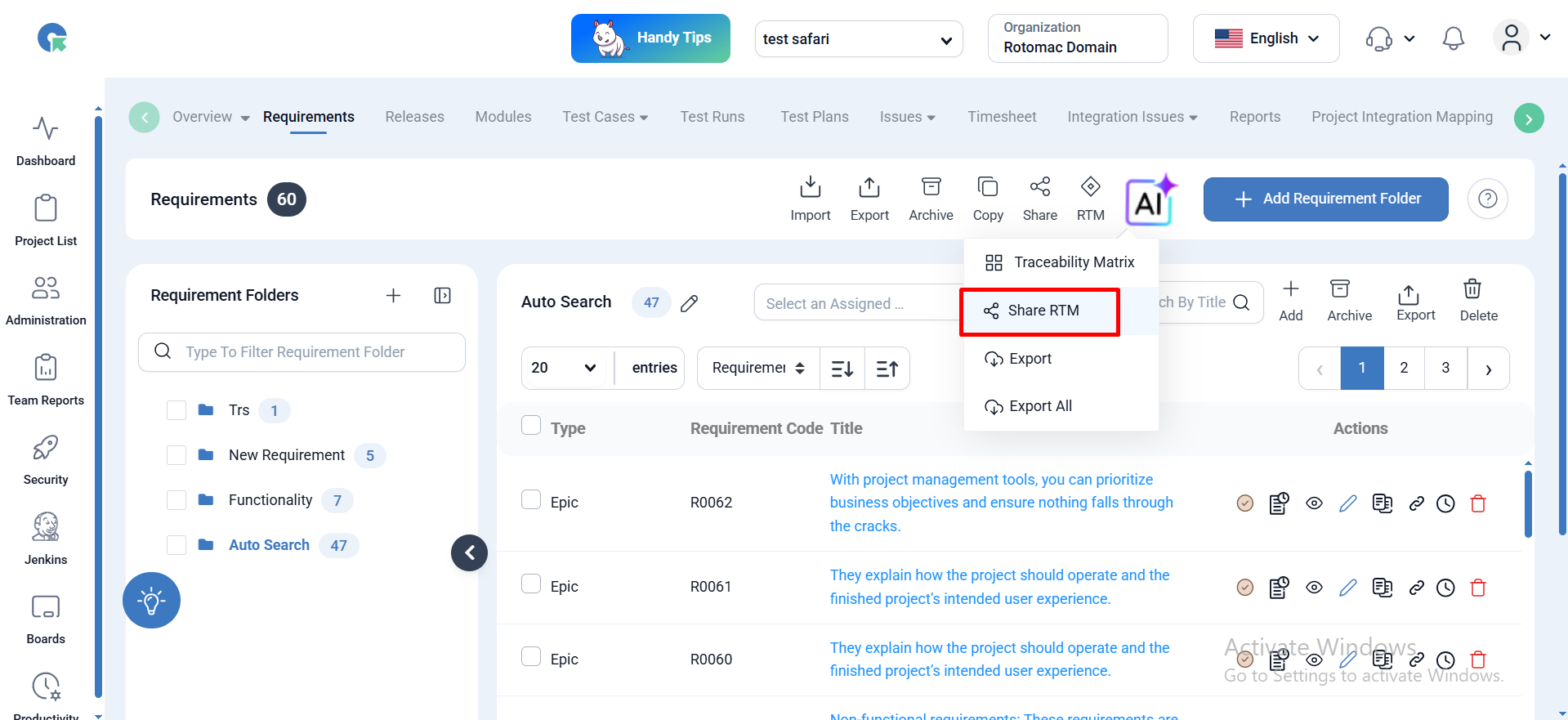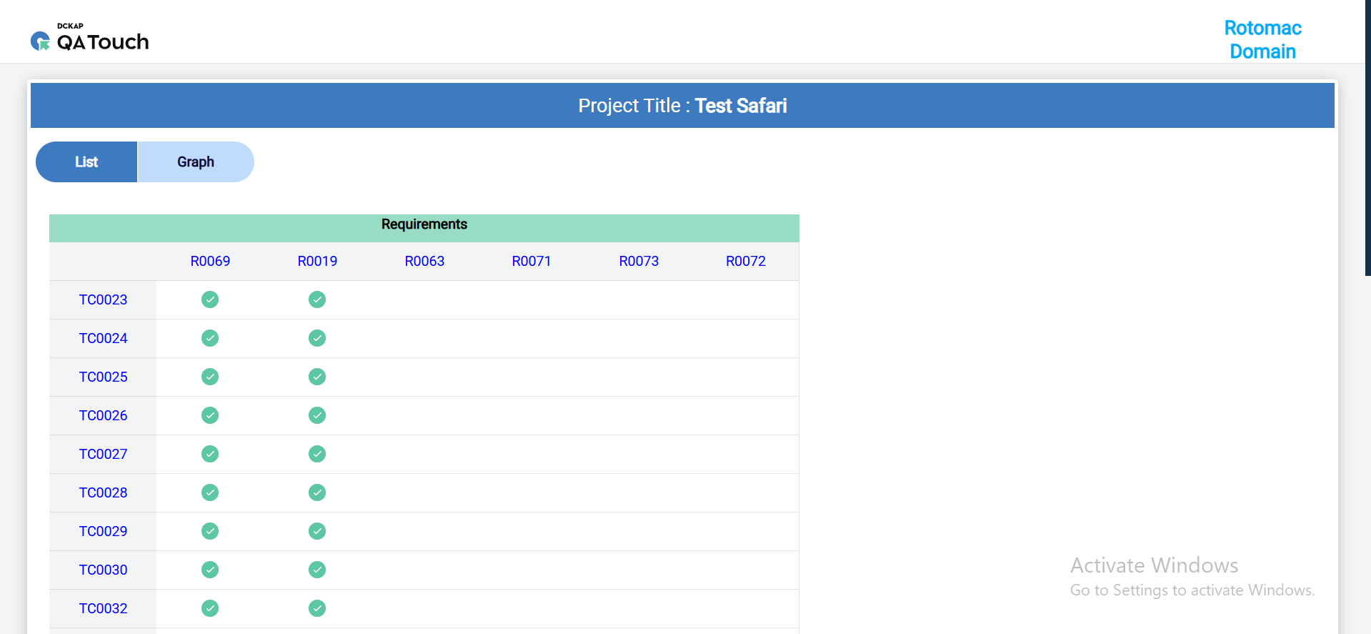 Go to Requirements→ Requirement Traceability (RTM) → Traceability Matrix