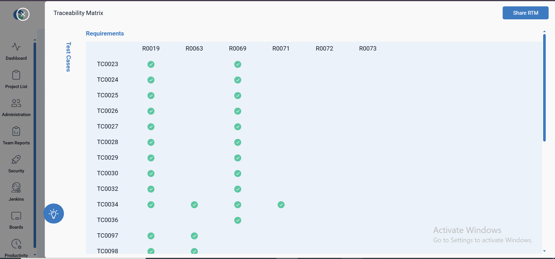 Public Shareable RTM in QA Touch allows you to generate a read-only, shareable link for the Requirement Traceability Matrix, so stakeholders can view requirement coverage and execution status without logging in.